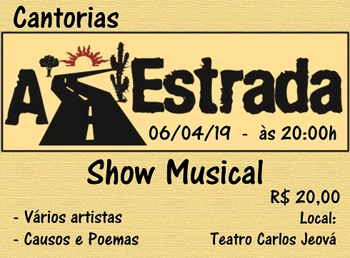Com participações especiais dos cantores e compositores Alisson Menezes, Jânio Arapiranga e Papalo Monteiro, o Teatro Carlos Jheová, em Vitória da Conquista, recebe neste sábado (dia 06/04), às 20 horas, “Cantorias A Estrada”, um show musical, de contadores de causos e declamações de poemas.