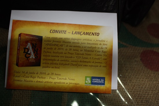 No próximo dia 14 de junho, a partir das 20 horas, vamos ter uma noite cultural com o lançamento do livro “ANDANÇAS”, a mais nova obra do jornalista e escritor Jeremias Macário que dessa vez mistura ficção com realidade, ao contrário do “Conquista Cassada” que foi um trabalho de pesquisa sobre a ditadura civil-militar em Vitória da Conquista, na Bahia e no Brasil e vai estar lá no evento.