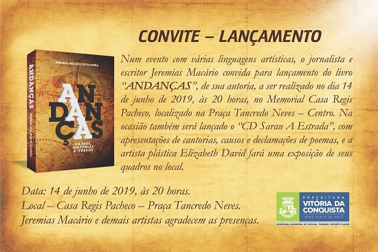 No próximo dia 14 de junho, a partir das 20 horas, vamos ter uma noite cultural com o lançamento do livro “ANDANÇAS”, a mais nova obra do jornalista e escritor Jeremias Macário que dessa vez mistura ficção com realidade, ao contrário do “Conquista Cassada” que foi um trabalho de pesquisa sobre a ditadura civil-militar em Vitória da Conquista, na Bahia e no Brasil e vai estar lá no evento.