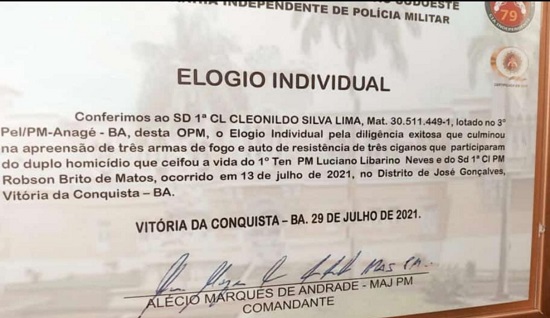 Enquanto a tragédia, com requintes de violência, escorraçou os ciganos de Conquista, suas “excelências” foram diplomadas com elogios pela atuação, como o 1º cl Cleonildo Silva Lima, lotado no 3º Pel/Anagé pela diligência que culminou na apreensão de três armas de fogo e auto de resistência de três ciganos que, de acordo com a própria corporação, fizeram parte dos assassinatos, no dia 13 de julho.