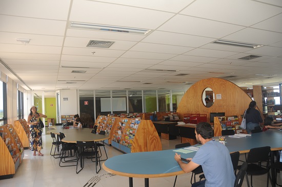 No edifício que faz parte do conjunto arquitetônico, no primeiro ou segundo andar, quem nos acolhe é uma biblioteca com mais de 20 mil volumes, com uma ala para a categoria infantil e outra para adultos. Tudo bem organizado como manda o figurino.