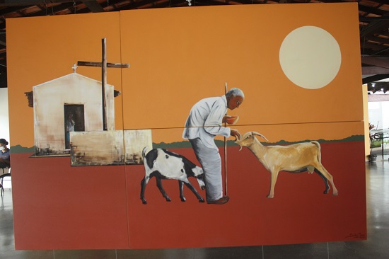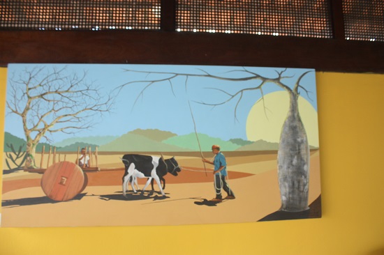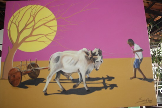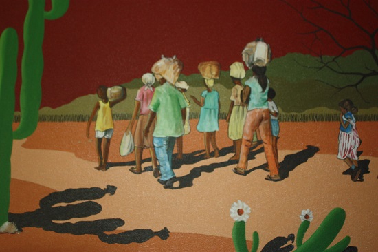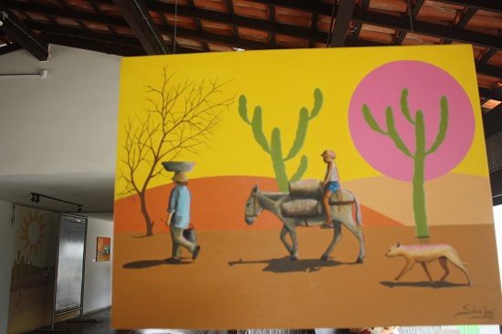 Ainda em sua exposição, suas pinturas retratam o carro-de-boi (um dos meus primeiros meios de transporte quando menino), as mulheres em sua labuta como fortes guerreiras e até chefes de famílias, o folclore do interior, a questão da escassez da água, o jumento (animal símbolo do Nordeste) que faz o transporte, representado na carga de carotes, a sequidão, os retirantes fugindo das estiagens em busca de outros lugares melhores, inclusive para o sul do pais e os folguedos, para demonstrar que o sertão não é só tristeza em preto e branco. O sertão é também o colorido das pessoas e das paisagens quando no chão batem as chuvas.