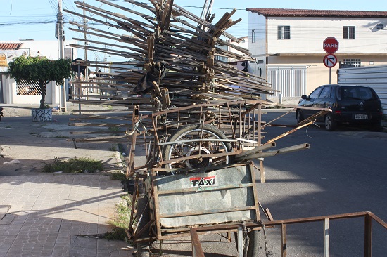 O título da foto “Armações”,clicada pelo jornalista Jeremias Macário faz alusão às barracas das feiras armadas por barraqueiros que vendem seus variados produtos, como frutas, verduras, tecidos, sandálias, cereais e tantos outros encontrados pelos consumidores. Estas armações amontoadas numa das ruas do Bairro Brasil estavam sendo levadas, ou recolhidas da tradicional “Feirinha”, em Vitória da Conquista, que faz tanto sucesso e superlota nos dias de sábados e domingos. Vem gente de toda parte da cidade e da zona rural da cidade para comprar e vender. Também serve como ponto de encontro de amigos, parentes e familiares. Eu mesmo sou um frequentador da “Feirinha” por conter uma variedade de alimentos e produtos por um preço mais baixo, e ainda com a vantagem da costumeira pechincha. Já encontrei muitos amigos por lá e comemos uma boa buchada gostosa com umas geladas.