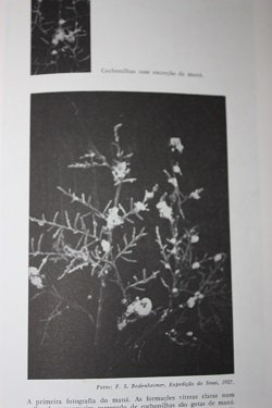 Formações vítreas claras num galho de tamargueira, carregado de cochonilhas. São galhos de maná (mannit)
